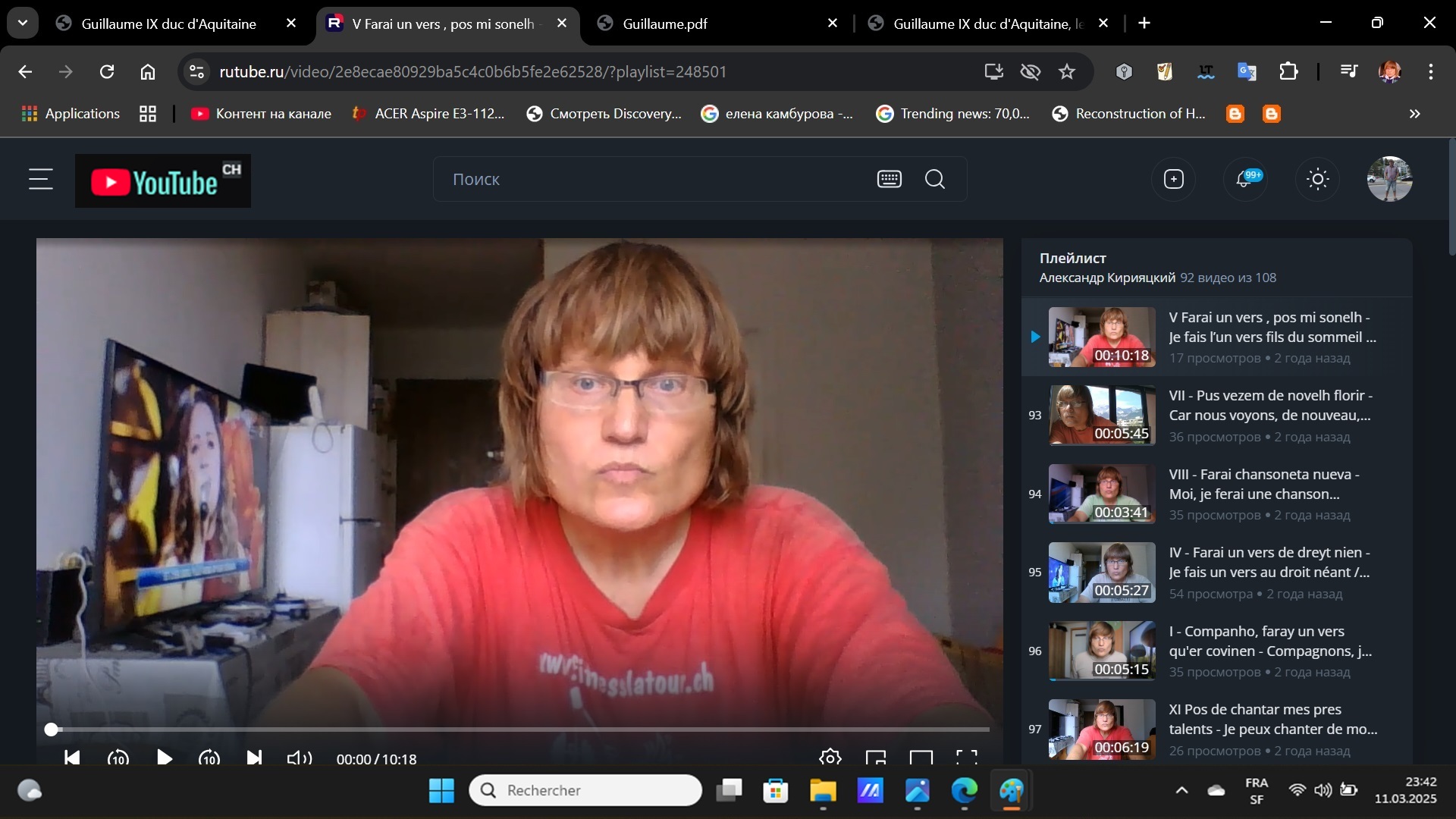 Les troubadours étaient les premiers poètes dans l’histoire de la littérature européenne. Ils ont commencé à utiliser le langage quotidien dans leur poésie. Ils ont fini de composer la poésie sans rime ou avec la rime primitive. Les troubadours ont introduit l’autre alternance des rimes à travers les lois: ABAABA, AAAB- CCCB-DDDB, AAABAB, AAAA, etc. Ils sont conçu leur premier but poétique. Leurs rimes avec leurs alternances se considèrent les plus riches, variables, diverses et productives dans l’histoire de toute la poésie d’Europe. La critique littéraire doit avoir les traits distincts des chansons des troubadours. Ils sont entrées dans la poésie mondiale et sont restées dans les poèmes des autres langues (française, allemande, espagnole, italienne, russe, etc.). La pensée s’exprime très souvent à travers le choix des alternances rimées et à travers la métrique; elles sont les premiers buts du traducteur, car les alternances rimées et les métriques ont formulé le développement du sujet, des images. Les poésies latines et arabes ont influé sur Guillaume IX. Plus tard, les influences de sa poésie enrichiront les poètes des époques suivantes. Le deuxième but, de composer les mêmes traductions poétiques, est l’individu de Guillaume IX dans ses chansons. Cette partie de l’étude doit embrasser les particularités de chaque son poème. Le troisième but est la guerre entre la latinisation de toute l’Europe et la naissance de la poésie populaire de néant en patois. En fin d’analyse, se réaliserait l’approbation de la traduction poétique en français 1) selon la raison, 2) selon la ligne 3) et selon l’interprétation poétique de tous les poèmes de Guillaume IX duc d’Aquitaine. Le lecteur français doit entendre les mélodies métriques de l’individu cosmique de Guillaume IX. Son individu est libre et identifié au cosme dans les choix des formes et des thématiques. Le même libertinage et la passion idolâtre conduisaient Guillaume IX aux poètes lyriques comme Fortunat à travers ses chansons. Au contraire, le développement thématique de chaque œuvre produit son sujet, c’est-à-dire, la narration sublimée qui enrichit la nouvelle condition courtoise. Sa contradiction et sa liberté renouvelée conçoivent l’opposition au lyrisme du passé et du futur, alors que la liberté détruit l’idéal céleste du lyrisme à travers sa naturalisation. Il faut rappeler que le même lyrisme, qui était formulé de Sapho et d’Horace à l’époque antique, se soumet aux normes du Moyen Âge formulées au VI siècle. Il était impossible de fixer ces normes sans codification, c’est-à-dire, sans sentiments codifiés à travers les allégories des images. Les unités des mêmes images n’avaient aucune connexion dans la prose. En outre, les joues des mots jolis des lyriques touchaient les cœurs sans sujet par la codification. Il y avait la liaison des joues des images allégoriques qui était ouverte au cœur et n’était jamais compris à travers le cerveau. Les poèmes de Guillaume IX ont trois groupes par leur genre. Seules trois chansons parmi toutes onze correspondent aux catégories du genre lyrique et appartiennent à notre premier groupe. 1) Elles portent les titres: «Molt jauzions mi prenc en amar (Gai et jovial je me prends à aimer)», «Ab la dolchor del temps novel (A la douleur du temps nouveau)» 2) Le deuxième groupe a les chansons du genre descriptif. Elles décrivent l’état spirituel du poète. Leur lyrisme est très conditionnel, car le sujet descriptif domine toujours et s’approche de la narration. En outre, il ne devient pas encore narratif. Les poèmes du deuxième groupe s’appellent: «IV Farai un vers de dreyt nien: (Je ferai un vers du droit néant (d’aucun droit)», «VII Pus vezem de novelh florir (Puisque nous voyons de nouveau fleurir)», «VI Ben vuelh que sapchon li pulzor (Bien on veut que on sache le contraste)» et « XI Pos de chantar m’es preès talentz, (Je peux chanter tout ce que m’est pris du talent) ». 3) La narration sarcastique s’attribue au troisième groupe. Elle oblige à dominer le sujet sur la description concrète de chaque évènement. Au troisième groupe de narration sarcastique appartiennent les poèmes suivants : «I Companho, // faray un //vers … convien: (Compagnon, je ferai un vers… convenable)», «II Compaigno, non puosc mudar qu’eo no m’effrei (Compagnons, je ne puis pas déplacer que je n’ai de quelque émoi) », III, «V Farai un vers, pos mi sonelh (Je ferai un vers puisque je suis endormi) », «VIII Farai chansoneta nueva (Je ferai la chansonnette nouvelle). Le traducteur poétique démonte que Guillaume IX est l’initiateur du rameau de tous les troubadours. Sa recherche effective essaye de garder 7 groupes par lesquels se formulent 10 types d’alternances rimées. Ces dernières produisent les règles des monorimes des troubadours. Elles sont apparues sous l’influence de onze chansons de Guillaume IX. Le but de ces traductions attire l’attention sur la particularité de l’individu et de son cosme poétique qui s’enveloppe dans les œuvres de Guillaume IX. Il faut analyser philosophiquement chaque quatrain, chaque sixain ou chaque septain dans lequel la réalité démontre qu’aucun phénomène ne peut pas apparaître de néant sans influences des autres phénomènes précédents. Le traducteur doit dévoiler de quelle façon se réalise la théorie des influences des fragments poétiques et de leurs formes d’Ambroise, d’Horace et d’Adjal Andalou, etc. sur Guillaume IX. Il y a un examen de l’histoire de la littérature. Il conçoit les suppositions des influences des hymnes anonymes du VIII au IX siècles sur « VII – Pus vezem de novelh florir », de saint Ambroise (IV s.) et de Dracontius (Controverse 194-198 (4-198) du V s.) sur « Farai un vers de dreyt nien », de la même Controverse 194-198 (4-198) de D