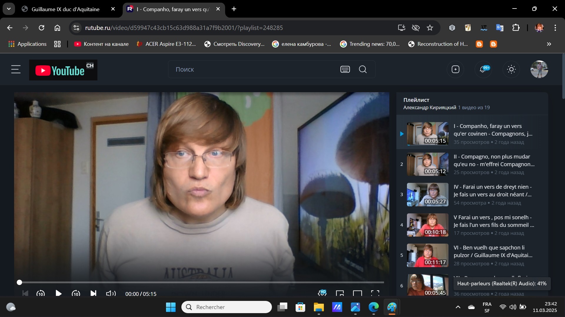 Les troubadours étaient les premiers poètes dans l’histoire de la littérature européenne. Ils ont commencé à utiliser le langage quotidien dans leur poésie. Ils ont fini de composer la poésie sans rime ou avec la rime primitive. Les troubadours ont introduit l’autre alternance des rimes à travers les lois: ABAABA, AAAB- CCCB-DDDB, AAABAB, AAAA, etc. Ils sont conçu leur premier but poétique. Leurs rimes avec leurs alternances se considèrent les plus riches, variables, diverses et productives dans l’histoire de toute la poésie d’Europe. La critique littéraire doit avoir les traits distincts des chansons des troubadours. Ils sont entrées dans la poésie mondiale et sont restées dans les poèmes des autres langues (française, allemande, espagnole, italienne, russe, etc.). La pensée s’exprime très souvent à travers le choix des alternances rimées et à travers la métrique; elles sont les premiers buts du traducteur, car les alternances rimées et les métriques ont formulé le développement du sujet, des images. Les poésies latines et arabes ont influé sur Guillaume IX. Plus tard, les influences de sa poésie enrichiront les poètes des époques suivantes. Le deuxième but, de composer les mêmes traductions poétiques, est l’individu de Guillaume IX dans ses chansons. Cette partie de l’étude doit embrasser les particularités de chaque son poème. Le troisième but est la guerre entre la latinisation de toute l’Europe et la naissance de la poésie populaire de néant en patois. En fin d’analyse, se réaliserait l’approbation de la traduction poétique en français 1) selon la raison, 2) selon la ligne 3) et selon l’interprétation poétique de tous les poèmes de Guillaume IX duc d’Aquitaine. Le lecteur français doit entendre les mélodies métriques de l’individu cosmique de Guillaume IX. Son individu est libre et identifié au cosme dans les choix des formes et des thématiques. Le même libertinage et la passion idolâtre conduisaient Guillaume IX aux poètes lyriques comme Fortunat à travers ses chansons. Au contraire, le développement thématique de chaque œuvre produit son sujet, c’est-à-dire, la narration sublimée qui enrichit la nouvelle condition courtoise. Sa contradiction et sa liberté renouvelée conçoivent l’opposition au lyrisme du passé et du futur, alors que la liberté détruit l’idéal céleste du lyrisme à travers sa naturalisation. Il faut rappeler que le même lyrisme, qui était formulé de Sapho et d’Horace à l’époque antique, se soumet aux normes du Moyen Âge formulées au VI siècle. Il était impossible de fixer ces normes sans codification, c’est-à-dire, sans sentiments codifiés à travers les allégories des images. Les unités des mêmes images n’avaient aucune connexion dans la prose. En outre, les joues des mots jolis des lyriques touchaient les cœurs sans sujet par la codification. Il y avait la liaison des joues des images allégoriques qui était ouverte au cœur et n’était jamais compris à travers le cerveau. Les poèmes de Guillaume IX ont trois groupes par leur genre. Seules trois chansons parmi toutes onze correspondent aux catégories du genre lyrique et appartiennent à notre premier groupe. 1) Elles portent les titres: «Molt jauzions mi prenc en amar (Gai et jovial je me prends à aimer)», «Ab la dolchor del temps novel (A la douleur du temps nouveau)» 2) Le deuxième groupe a les chansons du genre descriptif. Elles décrivent l’état spirituel du poète. Leur lyrisme est très conditionnel, car le sujet descriptif domine toujours et s’approche de la narration. En outre, il ne devient pas encore narratif. Les poèmes du deuxième groupe s’appellent: «IV Farai un vers de dreyt nien: (Je ferai un vers du droit néant (d’aucun droit)», «VII Pus vezem de novelh florir (Puisque nous voyons de nouveau fleurir)», «VI Ben vuelh que sapchon li pulzor (Bien on veut que on sache le contraste)» et « XI Pos de chantar m’es preès talentz, (Je peux chanter tout ce que m’est pris du talent) ». 3) La narration sarcastique s’attribue au troisième groupe. Elle oblige à dominer le sujet sur la description concrète de chaque évènement. Au troisième groupe de narration sarcastique appartiennent les poèmes suivants : «I Companho, // faray un //vers … convien: (Compagnon, je ferai un vers… convenable)», «II Compaigno, non puosc mudar qu’eo no m’effrei (Compagnons, je ne puis pas déplacer que je n’ai de quelque émoi) », III, «V Farai un vers, pos mi sonelh (Je ferai un vers puisque je suis endormi) », «VIII Farai chansoneta nueva (Je ferai la chansonnette nouvelle). Le traducteur poétique démonte que Guillaume IX est l’initiateur du rameau de tous les troubadours. Sa recherche effective essaye de garder 7 groupes par lesquels se formulent 10 types d’alternances rimées. Ces dernières produisent les règles des monorimes des troubadours. Elles sont apparues sous l’influence de onze chansons de Guillaume IX. Le but de ces traductions attire l’attention sur la particularité de l’individu et de son cosme poétique qui s’enveloppe dans les œuvres de Guillaume IX. Il faut analyser philosophiquement chaque quatrain, chaque sixain ou chaque septain dans lequel la réalité démontre qu’aucun phénomène ne peut pas apparaître de néant sans influences des autres phénomènes précédents. Le traducteur doit dévoiler de quelle façon se réalise la théorie des influences des fragments poétiques et de leurs formes d’Ambroise, d’Horace et d’Adjal Andalou, etc. sur Guillaume IX. Il y a un examen de l’histoire de la littérature. Il conçoit les suppositions des influences des hymnes anonymes du VIII au IX siècles sur « VII – Pus vezem de novelh florir », de saint Ambroise (IV s.) et de Dracontius (Controverse 194-198 (4-198) du V s.) sur « Farai un vers de dreyt nien », de la même Controverse 194-198 (4-198) de D